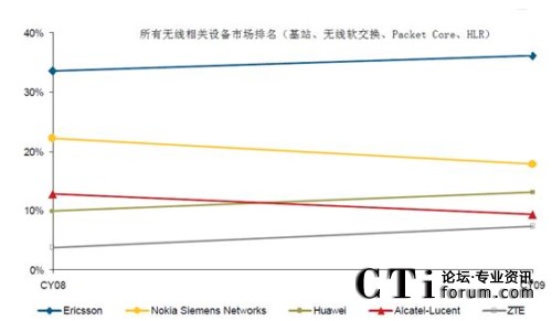 CTI論壇(ctiforum)4月16日消息(記者 潘婷婷): 近日,業(yè)內(nèi)著名調(diào)研公司Infonetics發(fā)布了2009年全球無線通信設(shè)備市場研究報(bào)告《2G/3G Mobile Infrastructure and Subscribers》。根據(jù)報(bào)告顯示,2009年全年,全球無線通信市場份額出現(xiàn)了較大變化,按載頻計(jì),中興通訊全年以12.6%的全球市場份額超越阿爾卡特-朗訊,居行業(yè)第4,按載頻計(jì),2009年全球無線設(shè)備出貨市場份額排名為愛立信、華為、諾基亞-西門子、中興、阿爾卡特-朗訊,分別為28.2%,22.1%,19%,12.6%和9.2%。