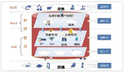 云化的智能管道如圖1所示,包括桌面云->接入云->控制云->感知云->應(yīng)用云,實際上是端管云一體化的網(wǎng)絡(luò)架構(gòu),建立一個可以自感知、自學(xué)習(xí)、自組織、自適配、自管理的數(shù)字神經(jīng)網(wǎng)絡(luò),提供云化的不同層次業(yè)務(wù)。