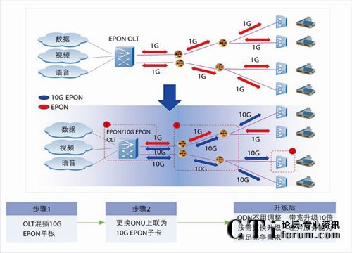 項(xiàng)目選取的試點(diǎn)小區(qū)建設(shè)于2006年,原來規(guī)劃的是每用戶6M帶寬。后期小區(qū)實(shí)裝率高,實(shí)際用戶超過1500戶,IPTV業(yè)務(wù)申請量提升后,出現(xiàn)了高峰時段IPTV點(diǎn)播業(yè)務(wù)不流暢、同時應(yīng)用IPTV和上網(wǎng)業(yè)務(wù)時網(wǎng)速過慢等問題。而且當(dāng)湖北電信新推出10M~20M的新寬帶套餐時,該小區(qū)用戶申請新套餐數(shù)量受限。該小區(qū)的寬帶接入網(wǎng)絡(luò)已經(jīng)明顯無法滿足用戶日益增長的需求,寬帶提速正當(dāng)其時。選擇10G EPON,能夠簡單兩步,將小區(qū)接入方式從EPON平滑升級為10G EPON,無需改變網(wǎng)絡(luò)結(jié)構(gòu),只需簡單升級設(shè)備(見圖)。
