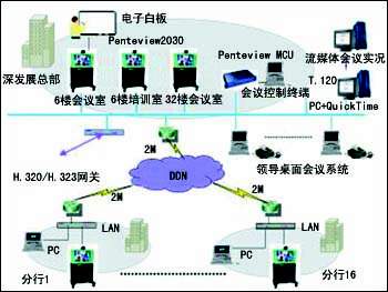 中太數(shù)據(jù)為深圳發(fā)展銀行構(gòu)建的視頻會議項目,是為深圳發(fā)展銀行在已有的DDN網(wǎng)絡(luò)的基礎(chǔ)上,構(gòu)建的一個全國性的會議電視平臺。通過這個平臺,使跨地域的溝通更加經(jīng)濟、高效和靈活。針對深發(fā)展的網(wǎng)絡(luò)實際情況以及會議電視的發(fā)展方向,方案中采用基于MPEG-4的Penteview2030產(chǎn)品,支持H.323的MCU Penteview 6182,以及Penteview數(shù)據(jù)會議服務(wù)器。整個深發(fā)展會議電視系統(tǒng)組網(wǎng)分為兩級,中心點3套Penteview 2030到下面的16個異地的分支行。深圳發(fā)展銀行大廈6樓大會議室、培訓(xùn)小會議室、32樓會議室作為主會議室,在6樓的機房中放置主MCU和一個終端,培訓(xùn)小會議室放置一個終端,其他16個異地分支行分別放置一臺Penteview2030終端,通過現(xiàn)有的深發(fā)展DDN網(wǎng)絡(luò)相互連通。根據(jù)深發(fā)展通信網(wǎng)絡(luò)結(jié)構(gòu)及傳輸容量的實際情況,該系統(tǒng)采用星型拓撲連接,各地可通過現(xiàn)有的DDN劃出768k-2M的帶寬,以視頻會議的方式組建起多點會議電視系統(tǒng)。各會場通過PC機實現(xiàn)數(shù)據(jù)會議功能。