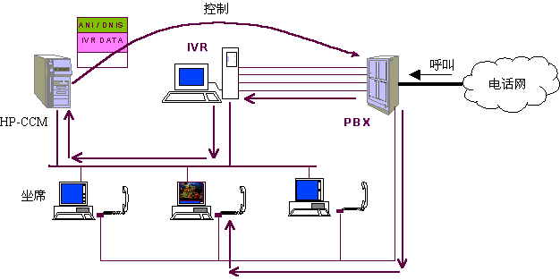 在任何一個步驟中,如客戶選擇了人工坐席,則IVR請求CCM根據(jù)多種情況選擇一個空閑坐席(選擇方法見下文)并控制PBX將呼叫與選擇的人工坐席接通,同時系統(tǒng)在客戶對IVR操作的過程中,已經(jīng)幀測到了客戶所使用的電話號碼、客戶的按鍵信息,系統(tǒng)還記錄有客戶上次的呼叫情況等數(shù)據(jù),這些數(shù)據(jù)基本上可以確定客戶大體關(guān)心的問題,對于老客戶甚至可以初步認定呼叫者的身份、年齡、性別、業(yè)務辦理情況等,因此,話務員在與客戶談話之前就已經(jīng)了解了相當多的信息,并控制選定的坐席屏幕顯示有關(guān)客戶信息,便于直接進入正題,提高了效率?蛻襞c坐席的交流過程中,坐席可通過終端請求CCM控制PBX將本次呼叫與其他話務員(坐席)、專家或業(yè)務辦公室(如內(nèi)線電話)等接通,當坐席人員將呼叫轉(zhuǎn)移到另一坐席或?qū)<視r,系統(tǒng)將在本呼叫中收集的各類數(shù)據(jù)同時轉(zhuǎn)向下一坐席電腦。在坐席人員解答客戶問題時,可將問題及解答情況收集,便于分析坐席人員的業(yè)務素質(zhì)和問題傾向,從而有針對性地培訓坐席人員。對于客戶來講,他可以通過電話按鍵在話務員、自動語音、傳真、專家和業(yè)務辦公室之間漫游,系統(tǒng)將記錄客戶漫游的路徑,對于設計較好的菜單和路經(jīng)來說,客戶的漫游路徑基本上可以反映出其需求,大量客戶的漫游路徑無疑將反映出市場需求。
