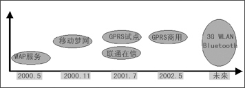 2000年5月,中國(guó)移動(dòng)推出了WAP服務(wù),但是由于準(zhǔn)備不足,加之中國(guó)移動(dòng)沒(méi)有完全轉(zhuǎn)變經(jīng)營(yíng)理念,使得WAP服務(wù)沒(méi)有達(dá)到預(yù)期的發(fā)展目標(biāo)。在吸取WAP服務(wù)的經(jīng)驗(yàn)、教訓(xùn)后,中國(guó)移動(dòng)于2000年11月又推出了“移動(dòng)夢(mèng)網(wǎng)”計(jì)劃。在這次的業(yè)務(wù)推廣中,短消息受到了人們的寵愛,發(fā)展到現(xiàn)在,SMS已經(jīng)深入多數(shù)移動(dòng)用戶的心中。2001年7月,中國(guó)聯(lián)通也推出了“聯(lián)通在信”與“移動(dòng)夢(mèng)網(wǎng)”進(jìn)行競(jìng)爭(zhēng)(如圖1所示)。與此同時(shí),中國(guó)移動(dòng)又開始了GPRS的試點(diǎn)工作,經(jīng)過(guò)近一年時(shí)間,“聯(lián)通在信”并沒(méi)有取得更好的成績(jī),而中國(guó)移動(dòng)的GPRS終于開始正式商用。那么,未來(lái)的移動(dòng)數(shù)據(jù)業(yè)務(wù)將依托什么來(lái)發(fā)展呢?是3G,還是WLAN、藍(lán)牙?大家只能拭目以待。