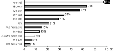 到底有多少人需要移動(dòng)數(shù)據(jù)業(yè)務(wù)呢?有資料顯示,當(dāng)前有36%的人對(duì)移動(dòng)數(shù)據(jù)業(yè)務(wù)處于觀望狀態(tài),只要移動(dòng)數(shù)據(jù)業(yè)務(wù)發(fā)展得好,他們肯定會(huì)加入進(jìn)來(lái)。我們相信,現(xiàn)在已經(jīng)有一定比例的人開始從觀望狀態(tài)加入使用移動(dòng)數(shù)據(jù)業(yè)務(wù)的行列中來(lái)。如圖2所示,在用戶需求中,電子郵件占67%,娛樂(lè)性的業(yè)務(wù)也占有較高的比例,新聞、信息類其次。這些數(shù)據(jù)說(shuō)明,人們使用移動(dòng)數(shù)據(jù)業(yè)務(wù),大部分的習(xí)慣是沿襲互聯(lián)網(wǎng)的,這也為移動(dòng)網(wǎng)絡(luò)與互聯(lián)網(wǎng)的結(jié)合奠定了用戶基礎(chǔ)。