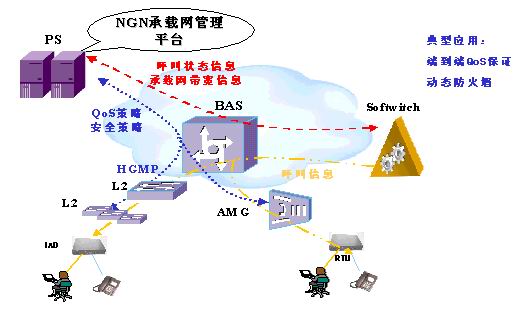 所有用戶接入BAS,BAS通過CAR可以對(duì)不同的用戶限制帶寬,PC分配較低的優(yōu)先級(jí)及帶寬,而對(duì)IAD分配較高的優(yōu)先級(jí)和帶寬,防止普通用戶對(duì)帶寬的無節(jié)制濫用。PS可以動(dòng)態(tài)收集BAS設(shè)備的帶寬使用情況,同時(shí)通過與軟交換的交互,了解NGN業(yè)務(wù)的帶寬需求,從而在BAS上可按用戶及業(yè)務(wù)的粒度進(jìn)行動(dòng)態(tài)QoS策略配置,為用戶提供差異性業(yè)務(wù),保證用戶的SLA。PS可以下發(fā)QoS策略給BAS,BAS交換機(jī)可以進(jìn)一步通過協(xié)議(各廠家私有協(xié)議)下發(fā)QoS策略給下掛的L2交換機(jī)。