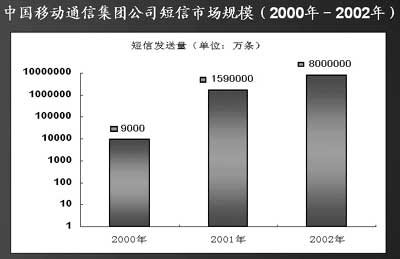 信息產(chǎn)業(yè)部預(yù)測(cè),2003年我國(guó)手機(jī)用戶(hù)將增加5000多萬(wàn),手機(jī)用戶(hù)短信普及率有可能從2002年的40%增加到60%。按照這種預(yù)測(cè),2003年,全國(guó)短信發(fā)送量將達(dá)到2000億條。