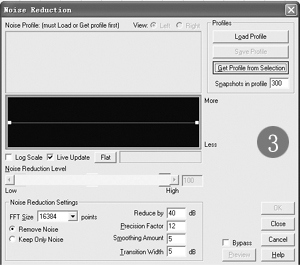 from Selection按鈕,程序會讀入噪音樣本,之后關(guān)閉該對話框回到主界面,單擊噪音樣本音軌,按Delete刪除它,再雙擊另外一個波音音軌,進(jìn)入波音編輯器界面再雙擊,全選之后按照上面的操作再次打開Noise