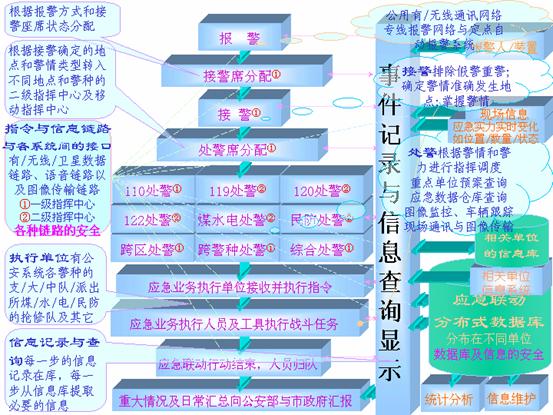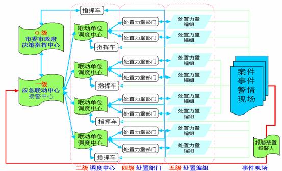 根據(jù)接過(guò)來(lái)的警情,應(yīng)急聯(lián)動(dòng)系統(tǒng)向處置力量部門發(fā)出指令派出處置力量編組到現(xiàn)場(chǎng),并根據(jù)現(xiàn)場(chǎng)反饋回來(lái)的信息,決定是否增援或歸隊(duì)。事件記錄通過(guò)局域網(wǎng)被送到相應(yīng)的處警員終端,處警員通過(guò)計(jì)算機(jī)輔助調(diào)度系統(tǒng)查詢相關(guān)資料,制定反應(yīng)措施,并向相關(guān)聯(lián)動(dòng)單位發(fā)出具體調(diào)度指令。在緊急事件發(fā)生時(shí),相應(yīng)的電子預(yù)案會(huì)被觸發(fā)啟動(dòng)。如果發(fā)生了重大災(zāi)難,險(xiǎn)情或特殊的事件,則可以啟用城市緊急狀態(tài)指揮室,由首長(zhǎng)進(jìn)行統(tǒng)一指揮。