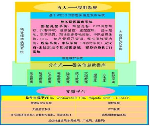 支撐平臺(tái)有計(jì)算機(jī)網(wǎng)絡(luò)系統(tǒng)、監(jiān)控系統(tǒng)、顯示系統(tǒng)、GPS系統(tǒng)、有/無(wú)線通信系統(tǒng)、圖像傳輸系統(tǒng)、電源及機(jī)房、軟件支撐平臺(tái)等。其中,計(jì)算機(jī)網(wǎng)絡(luò)系統(tǒng)包括指揮中心、二級(jí)指揮中心與移動(dòng)指揮中心、業(yè)務(wù)執(zhí)行機(jī)構(gòu)(如:應(yīng)急中隊(duì)、派出所等)之間的三級(jí)計(jì)算機(jī)網(wǎng)絡(luò),即指揮中心局域網(wǎng)絡(luò)、業(yè)務(wù)機(jī)關(guān)網(wǎng)絡(luò)、與分支機(jī)關(guān)的廣域網(wǎng)絡(luò)、與移動(dòng)指揮中心的遠(yuǎn)程訪問網(wǎng)絡(luò)。指揮中心與二級(jí)指揮中心、分支機(jī)構(gòu)、移動(dòng)中心之間有語(yǔ)音通信、數(shù)據(jù)通信,指揮中心與移動(dòng)中心有語(yǔ)音通信、數(shù)據(jù)通信(無(wú)線)、現(xiàn)場(chǎng)圖像傳輸;指揮中心與公安其它機(jī)構(gòu)通過(guò)撥號(hào)網(wǎng)絡(luò)訪問(內(nèi)網(wǎng)),指揮中心與普通老百姓通過(guò)撥號(hào)網(wǎng)絡(luò)訪問(外網(wǎng))。
