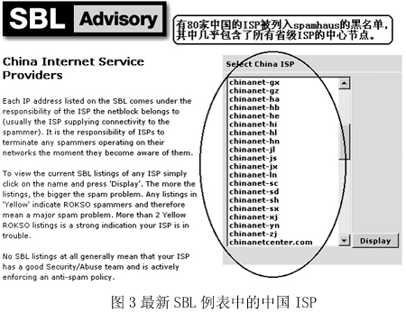 圖2是國(guó)際上著名的反垃圾郵件組織Spamhaus在網(wǎng)站上列出的統(tǒng)計(jì)排行榜,“China”已經(jīng)穩(wěn)居第二大垃圾郵件發(fā)送國(guó)的位置,而右邊的一個(gè)排行榜則從另一個(gè)角度向我國(guó)敲響了警鐘——在專為發(fā)送垃圾郵件的ISP所列的黑名單SBL中,我國(guó)Chinanet的兩個(gè)省級(jí)ISP在前10名中分列第2和第5名。而Chinanet作為中國(guó)的公用信息互聯(lián)網(wǎng)絡(luò),是我國(guó)的Internet骨干網(wǎng),是國(guó)內(nèi)用戶接入互聯(lián)網(wǎng)的主要途徑之一!拔覀冋娌幌M赃@樣的方式‘揚(yáng)名海外’”,來自一家ISP的一位不肯透露姓名的女士說,“其實(shí)我們也是受害者!”