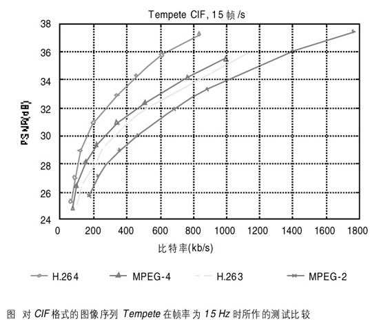 為了闡述H.264的編碼效率,我們將其與其它標(biāo)準(zhǔn)如MPEG-2、H.263、MPEG-4等作比較。使用QCIF、CIF格式的圖像序列作測試,所有編碼器都使用拉格朗日優(yōu)化技術(shù)。我們使用H.264的測試軟件JM2.0并使用了Main Profile的主要技術(shù)特征。對H.263和H.264采用的參考幀數(shù)為5,只編碼圖像序列的第一幀為I幀,每2個參考幀P之間插入2個非參考幀B。使用全搜索方式進(jìn)行32×32整數(shù)范圍的運動估計,且由預(yù)先設(shè)定的量化參數(shù)來進(jìn)行比特率的調(diào)整。圖為對CIF格式的圖像序列Tempete在幀率為15Hz時所作的測試比較。