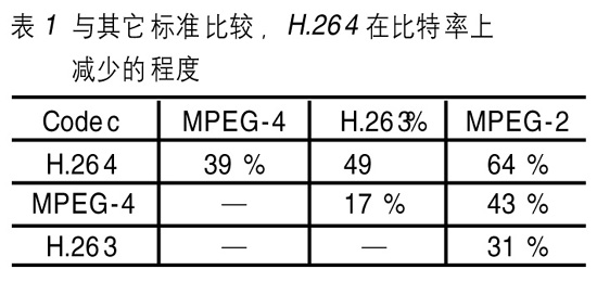 和其它標(biāo)準(zhǔn)比較,H.264在比特率上減少的程度如表1所示。