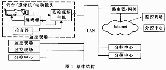 遠(yuǎn)程監(jiān)控系統(tǒng)一般包括三部分:前端監(jiān)控現(xiàn)場(chǎng)、通信設(shè)備和后端分控中心。整個(gè)系統(tǒng)基于Client/Server(客戶機(jī)/服務(wù)器)模式?傮w結(jié)構(gòu)如圖1所示。