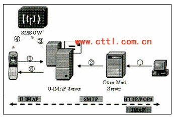 互聯(lián)網(wǎng)郵箱到聯(lián)通U-IMAP手機(jī)終端業(yè)務(wù)支持互聯(lián)網(wǎng)郵件用戶(hù)直接向手機(jī)終端用戶(hù)發(fā)送郵件,需要郵件服務(wù)器、U-IMAP Server以及移動(dòng)手機(jī)終端的支持,根據(jù)實(shí)際情況,有時(shí)還需要短信中心的支持,用于向移動(dòng)手機(jī)終端發(fā)送郵件到達(dá)的通知。郵件服務(wù)器與U-IMAP Server之間的協(xié)議采用SMTP協(xié)議,U-IMAP