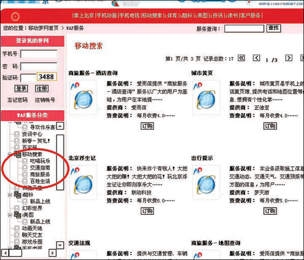 圖1 移動運營商網站上列出的移動搜索業(yè)務分類
