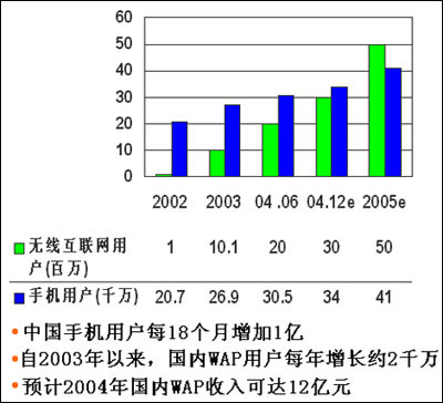 我們可以拿手機應用發(fā)展迅速的鄰國日本做比照,其WAP站點數量從100個增長到8萬多個,足足用了3年時間。劉斌認為,中國的WAP市場正在經歷一個上升期,“現在國內大大小小的WAP站點一共有2000來個,相對于國內龐大的手機用戶總數來說,只能算是發(fā)展的初期”,劉斌的言外之意是,在今后的兩年里,中文WAP資源仍值得期待。