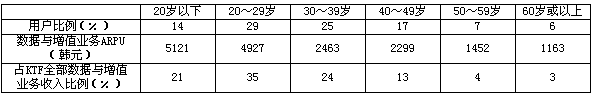 與競爭對手SKT一樣,KTF針對不同年齡段的用戶建立了個性化的獨立服務品牌,這些服務品牌分別是BiGi(主要針對13~18歲的未成年人)、Na(主要針對18~25歲的青年學生)、Main(針對25~35歲的男性用戶)、Hyo(針對35歲以上用戶)以及DRAMA(針對所有年齡的女性用戶)。從各年齡用戶群的業(yè)務使用情況看,占總用戶43%的30歲以下年輕用戶是KTF最主要的數據與增值業(yè)務消費群體。見表4。
