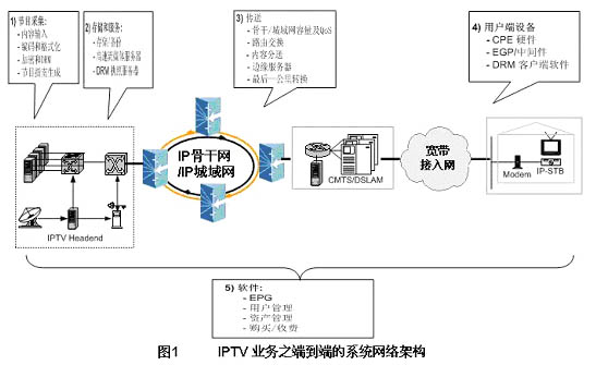 IPTV系統(tǒng)技術(shù)能用來(lái)提供將視音頻流媒體節(jié)目,如IP電視節(jié)目,從節(jié)目中心(first mile)播出,并通過(guò)骨干網(wǎng)、城域網(wǎng)和寬帶接入網(wǎng)(last mile)傳輸,直到被用戶接收之端到端的完整技術(shù)解決方案。一個(gè)端到端的IPTV系統(tǒng)一般具有節(jié)目采集、存儲(chǔ)和服務(wù)、節(jié)目傳送、用戶終端設(shè)備和相關(guān)軟件等五個(gè)功能部件。