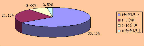 從圖1可知,電話用戶在本地通話中,通話時(shí)長(zhǎng)在1分鐘以下的占65.4%,1~3分鐘的占24.1%,兩者相加占總通話次數(shù)的89.5%。如果以通話時(shí)長(zhǎng)3分鐘為是否使用“彩話”業(yè)務(wù)的判斷點(diǎn),那么電話用戶通話次數(shù)中僅有10.5%需要設(shè)置“彩話”業(yè)務(wù),這與“彩鈴”用戶在100%的通話次數(shù)中采用“彩鈴”業(yè)務(wù)有相當(dāng)大的差距。