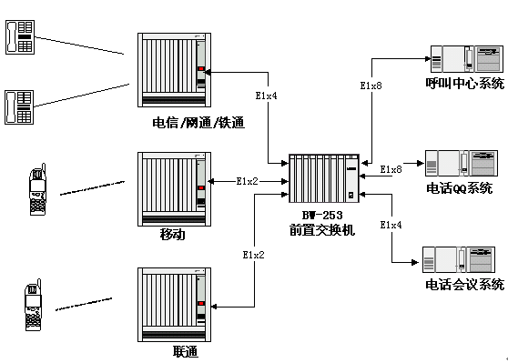 - 能與多個(gè)運(yùn)營(yíng)商的交換機(jī)連接,將呼叫分配到后端的多種語(yǔ)音業(yè)務(wù)系統(tǒng)。