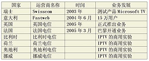 歐洲電信運營商在部署IPTV時,主要采用三重服務(triple-play)業(yè)務模式占領市場。該業(yè)務模式有助于電信運營商與有線電視運營商的競爭。目前,歐洲電信運營商已準備或開始IPTV的商業(yè)化進程。