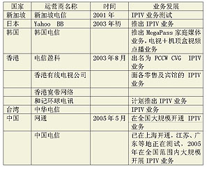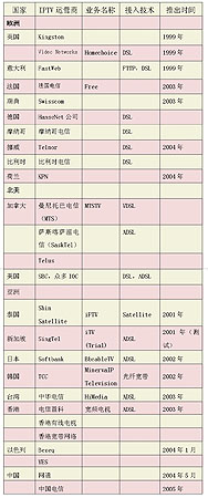 1999年,英國Video Networks公司率先在全球推出了IPTV業(yè)務,此后,國外許多電信運營商先后進入IPTV市場。但在2004年之前,多數運營商僅側重于IPTV的試驗,2004年后,IPTV開始從試驗階段向商用階段轉變,許多業(yè)界人士認為,2005年將成為IPTV年。