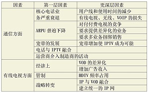 IPTV市場發(fā)展的驅動力主要有兩個方面:一是通信方面的因素,二是有線電視方面的因素(詳見表4)。