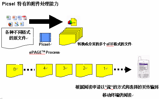 Picsel的附件處理服務(wù)器和移動(dòng)終端的文件瀏覽的客戶端可以很容易地分別與PUSH MAIL服務(wù)器或網(wǎng)關(guān)以及移動(dòng)終端上的PUSH MAIL的客戶端集成在一起,提供一個(gè)完整的能夠處理附件的PUSH MAIL的整體解決方案,將電子郵件中的各種不同格式的文件附件在不改變其原來(lái)格式和頁(yè)面的情況下打開(kāi)和顯示。
