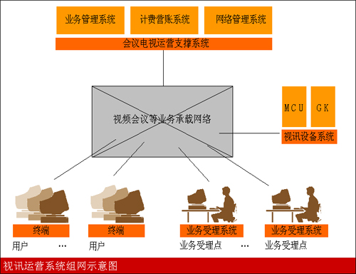 在視訊會(huì)議運(yùn)營網(wǎng)絡(luò)中最主要的組成部分是運(yùn)營支撐系統(tǒng)和視訊硬件平臺(tái)。其中的運(yùn)營支撐系統(tǒng)主要指用來幫助電信運(yùn)營商將電信服務(wù)產(chǎn)品提供給客戶使用以獲取收益,并對(duì)擁有的設(shè)備進(jìn)行維護(hù)管理的系統(tǒng)。運(yùn)營支撐系統(tǒng)將為用戶提供全面的業(yè)務(wù)開通、業(yè)務(wù)保障和業(yè)務(wù)計(jì)費(fèi)功能。