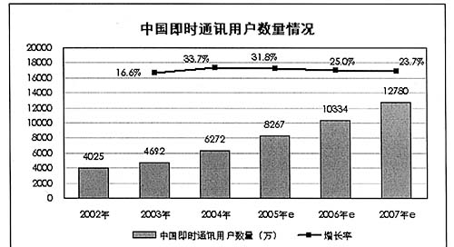 圖為:02年-07年中國(guó)即時(shí)通訊用戶數(shù)量及增長(zhǎng)率 來(lái)源:艾瑞咨詢