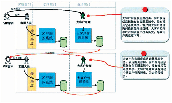 投訴的后臺處理流程分布在BOSS系統(tǒng)、1860客服中心、DSMP數(shù)據(jù)業(yè)務管理平臺以及OA多個業(yè)務支撐系統(tǒng)之中,系統(tǒng)之間相對獨立,同時投訴的交互數(shù)據(jù)分散在各個系統(tǒng)內,沒有一個完整、統(tǒng)一的客戶投訴資料,從而無法在不同的服務渠道中取得完整的客戶投訴信息,影響了客戶服務的質量。當公司管理層需要了解某一項活動的開展情況或近期的投訴熱點、焦點問題時,操作人員只能采用傳真方式,臨時要求全省17地市、公司在一定時間內上報,匯總后研究分析再行提交,使投訴熱點或焦點問題不能及時反饋給管理層。信息嚴重滯后,更談不上針對客戶投訴咨詢熱點問題進行數(shù)據(jù)挖掘,推出針對性的營銷策略。