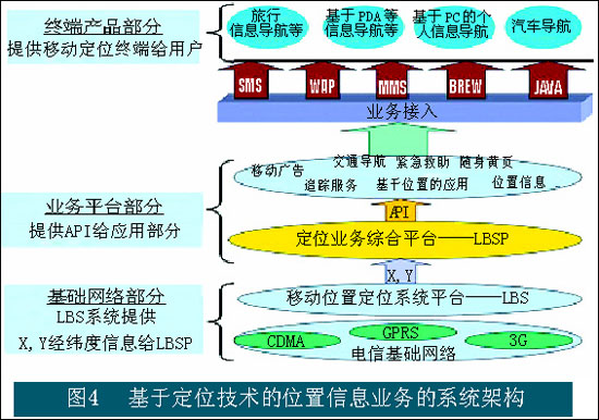 其中在基礎(chǔ)網(wǎng)絡(luò)層面中,LBS系統(tǒng)提供X、Y經(jīng)緯度信息,并把信息傳遞到定位業(yè)務(wù)綜合平臺。提供不同位置應(yīng)用的平臺部分通過接口的方式獲取位置信息,進行面向特定業(yè)務(wù)的計算。終端用戶通過移動終端并以不同的接入方式獲取位置類的信息服務(wù)。