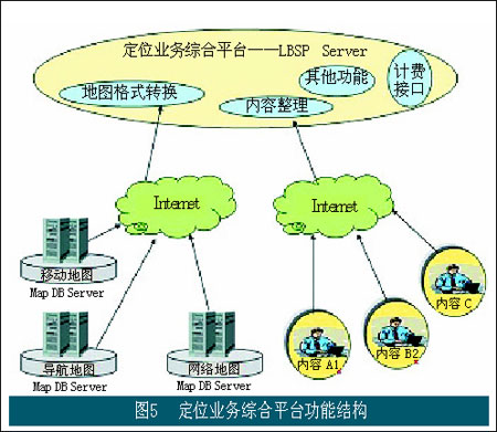 在上述結(jié)構(gòu)中,定位業(yè)務(wù)綜合平臺LBSP扮演著重要角色。其功能結(jié)構(gòu)如圖5所示。在該平臺中提供位置類信息業(yè)務(wù)的業(yè)務(wù)運營支撐功能,包括計費功能(以及和BOSS系統(tǒng)的接口);同時該平臺還扮演著接入不同內(nèi)容開發(fā)商的重要角色。不同的內(nèi)容開發(fā)和提供商通過該平臺向最終用戶提供具體的業(yè)務(wù)和應(yīng)用,運營商通過該平臺對不同內(nèi)容開發(fā)商提供的內(nèi)容進行管理和整理,使面向用戶的應(yīng)用能夠順利得到展現(xiàn)。該平臺提供的另一個重要角色是肩負(fù)著接入地圖信息提供商的重任,并在該平臺中通過地圖格式的轉(zhuǎn)換使不同地圖提供商所提供的地圖信息能夠以一致的格式向用戶提供。