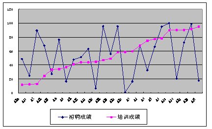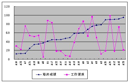 我們通過分析,圖3顯示,員工的培訓(xùn)成績和其工作績效是無關(guān)的,這說明培訓(xùn)是無效的。無效的原因也許是由于培訓(xùn)內(nèi)容不合理或培訓(xùn)組織實施不善等原因,總之培訓(xùn)是無效的,需要改進(jìn)。