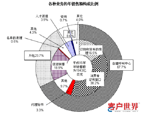 從這張表可以看到,這些公司的坐席數(shù)都是比較多的,規(guī)模比較大。從行業(yè)分類來說主要是以金融業(yè)為主,還有其它。這個(gè)其它比較多的是指通訊行業(yè)。這個(gè)結(jié)構(gòu)同時(shí)又是日本原來叫做“通產(chǎn)省”,現(xiàn)在叫“經(jīng)濟(jì)產(chǎn)業(yè)省”,它是針對各個(gè)行業(yè)進(jìn)行的一個(gè)調(diào)查,可以看到它調(diào)查的結(jié)果,同樣也是在制造業(yè),還有金融業(yè),通訊業(yè)是在資料中心這個(gè)領(lǐng)域占很大的比例。