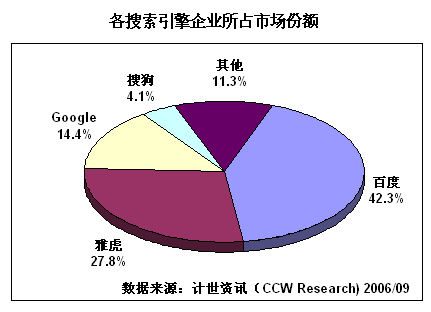互聯(lián)網(wǎng)上的信息浩如煙海,是典型的信息爆炸,因此絕大多數(shù)網(wǎng)民都必須依靠搜索引擎才能找到所需信息,這個龐大的需求也就注定了搜索引擎市場的興旺繁榮。計世資訊(CCW Research)數(shù)據(jù)顯示:2004年中國的搜索引擎市場銷售總額達到9.4億元人民幣,增長67.9%,2005年繼續(xù)保持47.9%的增長速度,達到13.9億元,到2006年預(yù)計這個數(shù)字將突破20億元大關(guān)。
