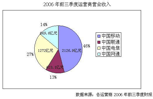 近日,四大運營商紛紛公布2006年前三季度的財務(wù)報表,截止9月底中國移動營運收入達(dá)到2126.91億元,比上年同期增長20.8%,遠(yuǎn)遠(yuǎn)高于競爭對手中國聯(lián)通的營業(yè)收入增長5.6%,而固網(wǎng)運營商中國電信和中國網(wǎng)通的收入增長更低,僅為4.5%和2.03%。透過這些數(shù)字,我們看到的是運營商實力差距的進(jìn)一步拉大。