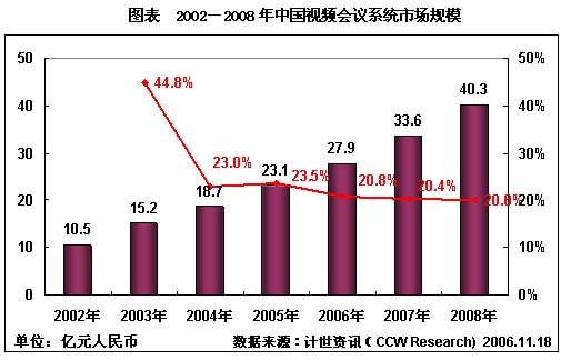 在2003年的井噴式發(fā)展之后,視頻會(huì)議系統(tǒng)市場(chǎng)發(fā)展速度開(kāi)始進(jìn)入低速發(fā)展階段,市場(chǎng)逐漸出現(xiàn)飽和的趨勢(shì)。計(jì)世資訊(CCW Research)最新視頻會(huì)議報(bào)告數(shù)據(jù)顯示,從2003年非典時(shí)期視頻會(huì)議市場(chǎng)井噴式發(fā)展之后,2006年視頻會(huì)議系統(tǒng)的增長(zhǎng)率開(kāi)始下降,如何開(kāi)發(fā)新的產(chǎn)品,成為視頻會(huì)議系統(tǒng)市場(chǎng)繼續(xù)發(fā)展的關(guān)鍵。而3G商用的到來(lái),由此產(chǎn)生的移動(dòng)視頻業(yè)務(wù)也必將成為未來(lái)移動(dòng)通信新的市場(chǎng)增長(zhǎng)點(diǎn),可以說(shuō),移動(dòng)信息化建設(shè)將為視頻會(huì)議系統(tǒng)開(kāi)拓一片新的藍(lán)海。