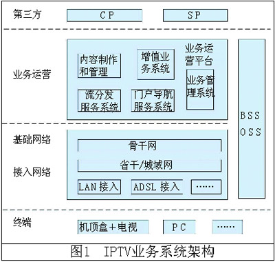 IPTV業(yè)務系統(tǒng)架構可分為四層: 第三方業(yè)務提供者如CP和SP、業(yè)務運營層、網(wǎng)絡承載層和用戶終端層(如圖1)。