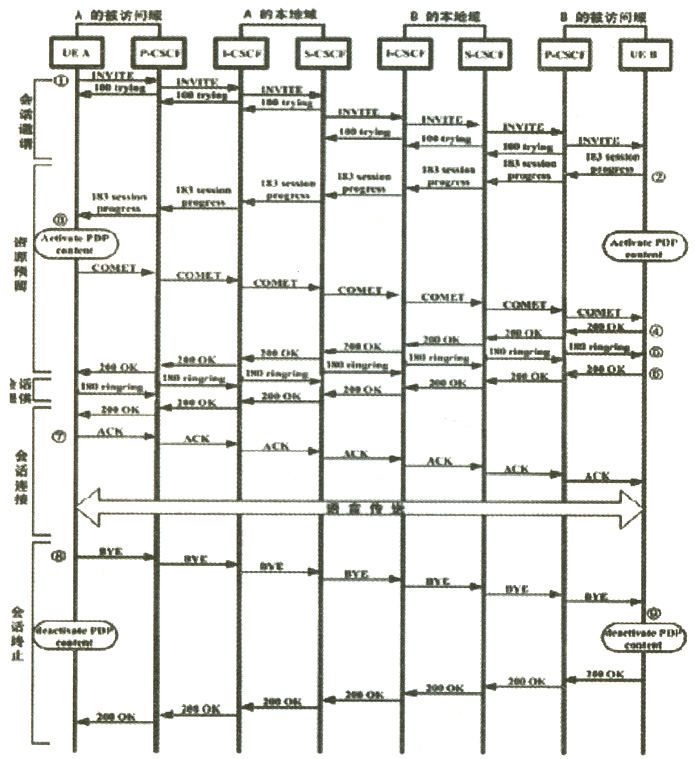 B接受了這個會話請求,但此時他不回鈴?fù)ㄖ狝,他返回183sessionprocess應(yīng)答表示他接受該會話,同時要求A對此表示確定,這個應(yīng)答通過各個CSCF傳給A。同時B激活一個GPRSPDP上下文,它被用來通過IMS的IP接入點來建立語音通道。