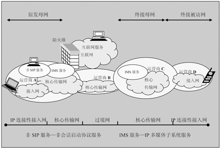 如圖3所示,與一個被訪問的網(wǎng)不同,IP多媒體子系統(tǒng)還支持母網(wǎng)的概念。在這個例子中,母網(wǎng)是支持具有登錄權(quán)的IP多媒體子系統(tǒng)的核心網(wǎng)。被訪問的網(wǎng)是當前向用戶提供IP多媒體子系統(tǒng)服務連接的網(wǎng)。圖3中的運營商A擁有許多疊接網(wǎng)用戶的母網(wǎng),而運營商C擁有移動電話的母網(wǎng),而用戶正在運營商D的網(wǎng)絡中漫游。