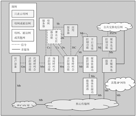 圖4給出了構(gòu)成IP多媒體子系統(tǒng)功能結(jié)構(gòu)的功能實體和參考點,還表明了IP多媒體子系統(tǒng)的實體在母網(wǎng)和被訪網(wǎng)之間是如何分布的。