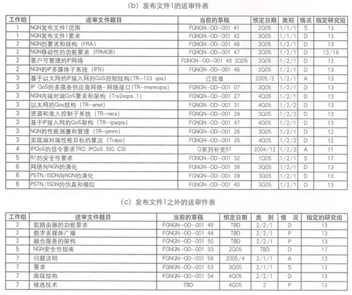 2005年5月之前,下一代網(wǎng)絡(luò)重點(diǎn)工作組已完成了計(jì)劃中的26個(gè)送審文件中的3個(gè)。所有的送審文件都必須指定專門的發(fā)布文件。遵循第13研究組的決定,下一代網(wǎng)絡(luò)重點(diǎn)工作組至少應(yīng)完成發(fā)布文件1的送審稿。表2給出了下一代網(wǎng)絡(luò)重點(diǎn)工作組按發(fā)布文件分類的送審件。
