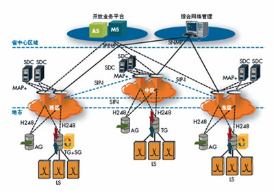 呼叫控制和信令層:三對(duì)軟交換被放置于省內(nèi)的三個(gè)區(qū)域,為網(wǎng)絡(luò)上的700多萬用戶提供呼叫控制和信令交換。這三個(gè)分離的區(qū)域提供省內(nèi)范圍的話務(wù)以及容災(zāi)備份。雙歸屬機(jī)制被引入從而能夠在集中式的網(wǎng)絡(luò)拓?fù)渲斜U习踩透呖煽啃浴?br />
