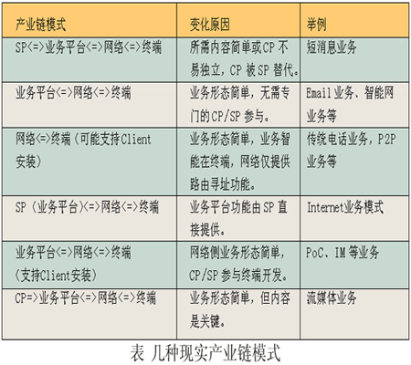 =>網(wǎng)絡(luò)< =>終端,而現(xiàn)實(shí)中的產(chǎn)業(yè)鏈模式可以通過(guò)該模式變化得到,如下表所示。