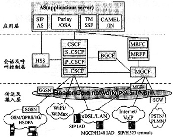 一般IMS分為三層,應用層支持各類應用服務器,負責為用戶提供增值業(yè)務和第三方業(yè)務。會話及呼叫控制層負責管理呼叫或會話設置,其中呼叫會話控制模塊CSCF完成呼叫網(wǎng)關功能、呼叫業(yè)務觸發(fā)功能和路由選擇功能,將SIP信令消息正確地轉(zhuǎn)發(fā)到應用服務器。歸屬用戶服務器HSS用于維護每個終端用戶獨有的業(yè)務屬性,包括IP地址、漫游信息、好友列表、呼叫業(yè)務定制信息及語音郵件設置等。HSS是全網(wǎng)可用資源。媒體資源功能MRF包括MRFP和MRFC,負責提供及控制媒體流資源,如播放通知音、媒體流的混合、編解碼等。媒體網(wǎng)關控制MGCF負責PSTN承載與IP流之間的連接,根據(jù)被叫號碼和來話情況選擇CSCF,并完成PSTN與IMS之間的呼叫控制協(xié)議轉(zhuǎn)換,如將從CSCF接收到的SIP消息轉(zhuǎn)換為MEGACO或ISUP消息,并通過IP發(fā)送到信令網(wǎng)關SGW。出口網(wǎng)關控制功能BGCF主要實現(xiàn)呼叫路由功能,為呼叫選擇適當?shù)腜STN接口點,若發(fā)現(xiàn)該接口點與自己在同一網(wǎng)絡,則選擇本網(wǎng)絡的MGCF與PSTN交互,若發(fā)現(xiàn)接口點在另一網(wǎng)絡時,BGCF將會話信令轉(zhuǎn)發(fā)給另一網(wǎng)絡相應的BGCF。一個IMS可以包含一個或多個CSCF、HSS、MGCF等功能模塊。傳送及接入層承載各種類型之間的轉(zhuǎn)換,完成與傳統(tǒng)PSTN/PLMN間的互通等功能,包括各類有線接入、無線接入、互聯(lián)互通網(wǎng)關等設備。
