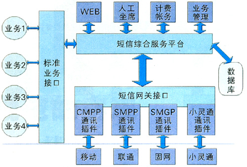 業(yè)務管理平臺是為運營商提供的可快速啟動各種數(shù)據(jù)業(yè)務的平臺,具有強大的資源調度能力。它連接運營商的基礎網(wǎng)絡和業(yè)務支撐系統(tǒng)(客服系統(tǒng)、計費系統(tǒng)),為服務提供商/內容提供商們提供各種移動資源(如短信息中心資源、用戶信息資源、語音資源等)、功能資源(如單點認證、計費、漫游控制等)及各種公共的資源引擎(如地理位置、語音交互、推送信息等)。業(yè)務支撐系統(tǒng)是運營商為了開展業(yè)務必須建設的客服系統(tǒng)、營業(yè)系統(tǒng)、計費系統(tǒng)等子系統(tǒng)。圖3是目前常用的綜合短信平臺[3]。