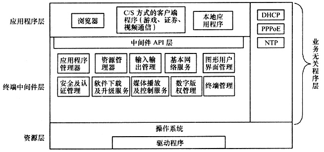 業(yè)務(wù)無關(guān)程序?qū)樱喊ǜ鞣N直接運行在操作系統(tǒng)之上,與IPTV業(yè)務(wù)無關(guān)的程序,如DHCP、PPPoE接入認證程序等。程序直接運行在OS之上,可以提高運行效率。這些程序與終端中間件軟件一樣,在引入新的機頂盒時要進行移植,但這些程序通常具有業(yè)務(wù)無關(guān)性,遵循通用的接口協(xié)議,因此能做到快速移植。