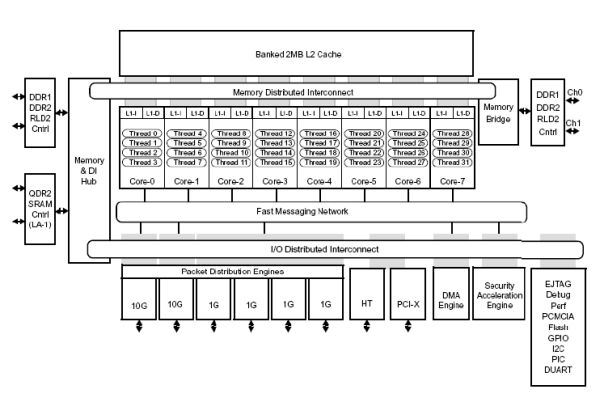 今年以來,RISC多核處理器在網(wǎng)絡(luò)設(shè)備的應(yīng)用加速,我們注意到另一家智能網(wǎng)絡(luò)用多核處理器供應(yīng)商Cavium Networks公司也宣布推出了多核網(wǎng)絡(luò)處理器OCTEON產(chǎn)品系列,該系列由1到16個基于MIPS64技術(shù)的cnMIPS內(nèi)核構(gòu)成,能夠在單一芯片上提供高達16GHz的64位計算處理能力。此外,OCTEON還采用了最先進的多層次應(yīng)用加速技術(shù),用于支持網(wǎng)絡(luò)控制、數(shù)據(jù)和服務(wù)應(yīng)用等。OCTEON處理器產(chǎn)品系列集成了多達8個Gigabit端口、雙SPI-4.2、PCI-X、高達144-bit的DDR2控制器、雙8-bit