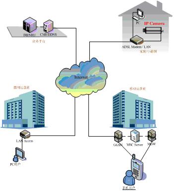 IP Camera在海外已屬于逐漸成熟市場,2007年全球?qū)⒂谐^500萬臺的出貨。據(jù)專業(yè)機構(gòu)預測,IP Camera市場將在2009年超越模擬Camera(IDC)市場達到并超過10億美元(IMS Research)。而截至2006年7月,全球移動用戶數(shù)已經(jīng)達到了24.5億,并以每天約100萬的速度在增長。在此基礎上,伴隨著固定移動融合(FMC),隨時隨地的視頻瀏覽和安全監(jiān)控相結(jié)合——手機IP監(jiān)控需求應運而生,尤其是在無線網(wǎng)絡帶寬發(fā)達的國家和地區(qū),其應用領域十分廣闊,包括家庭監(jiān)控(包括小孩照料、寵物看管和財產(chǎn)保護等)、專業(yè)監(jiān)控、交通監(jiān)測、實時廣告等業(yè)務已經(jīng)開始為大眾所接受。其業(yè)務模型如下: