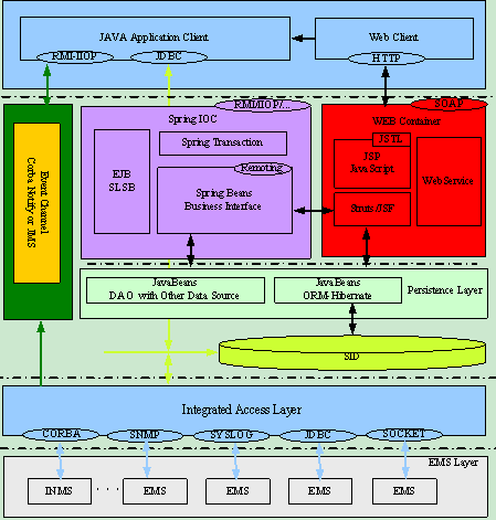 展現層分為兩類用戶界面,一種是Java Application類胖用戶界面;另外一種是純HTTP Web瘦客戶界面。Java Application頁面用于實現拓撲管理等現階段不易于采用Web技術實現的交互頁面,與其他各層的交互協議主要采用RMI-IIOP或JDBC。